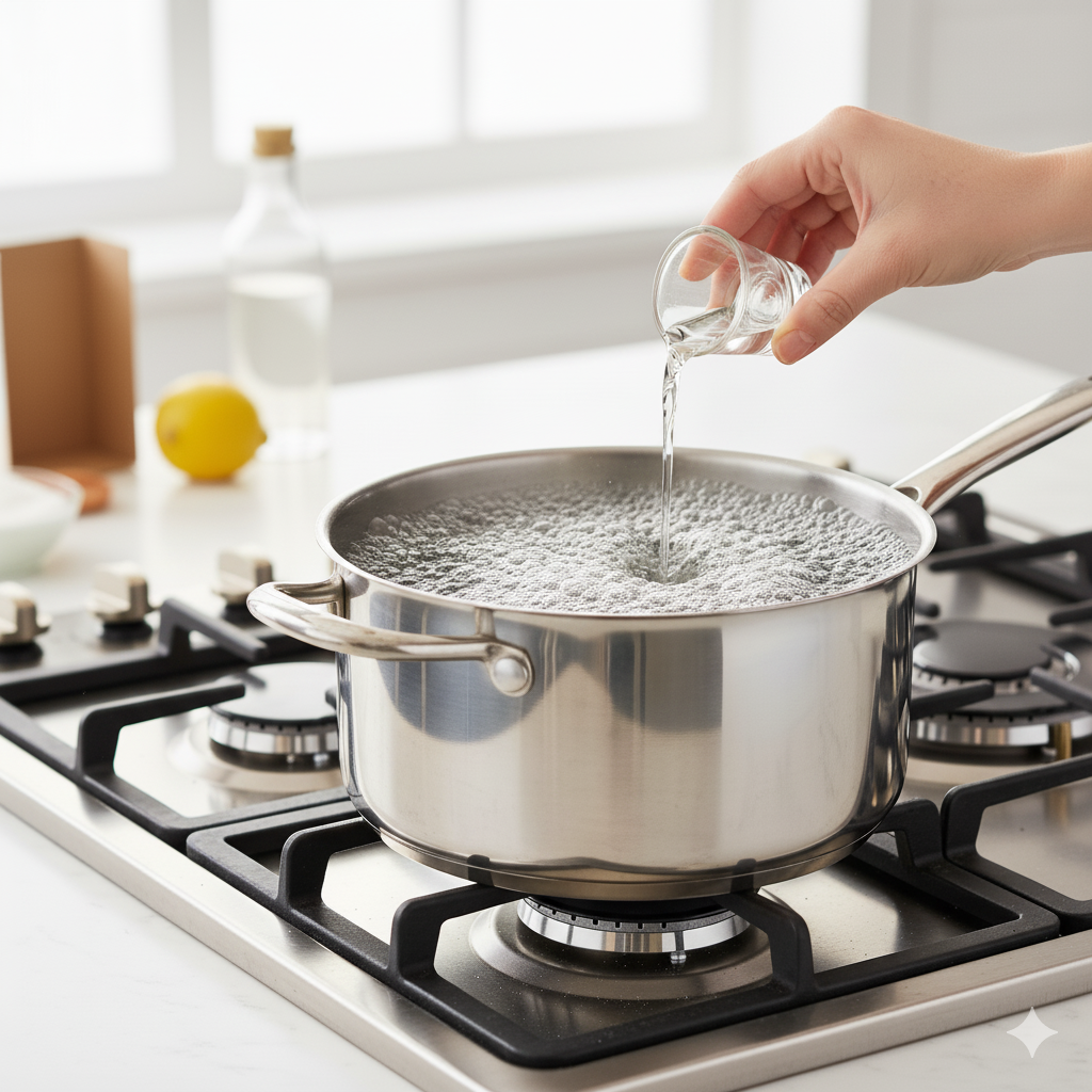 - 재료 넣기: 베이킹소다 1~2스푼과 식초를 소주잔 반 잔 정도 넣습니다. (베이킹소다는 알칼리성, 식초는 산성이라 둘이 만나면 탄 자국을 분해하는 중화 작용이 일어납니다.)
