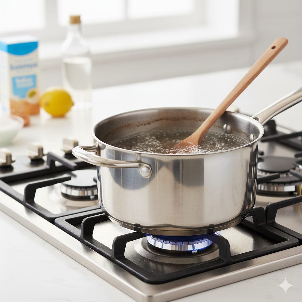 - 냄비에 물을 붓고 끓이기: 냄비의 탄 부분이 잠길 정도로 물을 채웁니다.