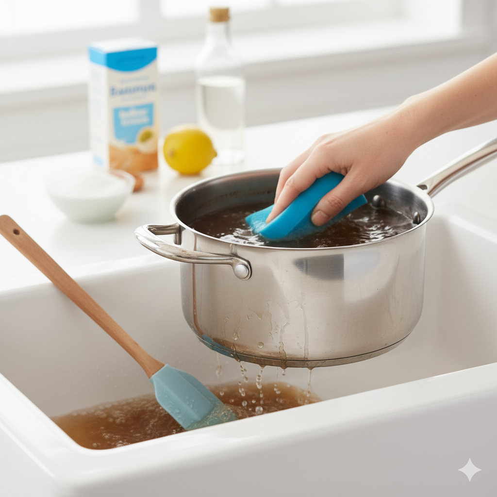 - 불린 후 닦기: 불을 끄고 30분에서 1시간 정도 그대로 두어 탄 자국을 충분히 불려줍니다. 너무 심하게 탄 경우는 하룻밤 정도 불려두는 것이 좋습니다.