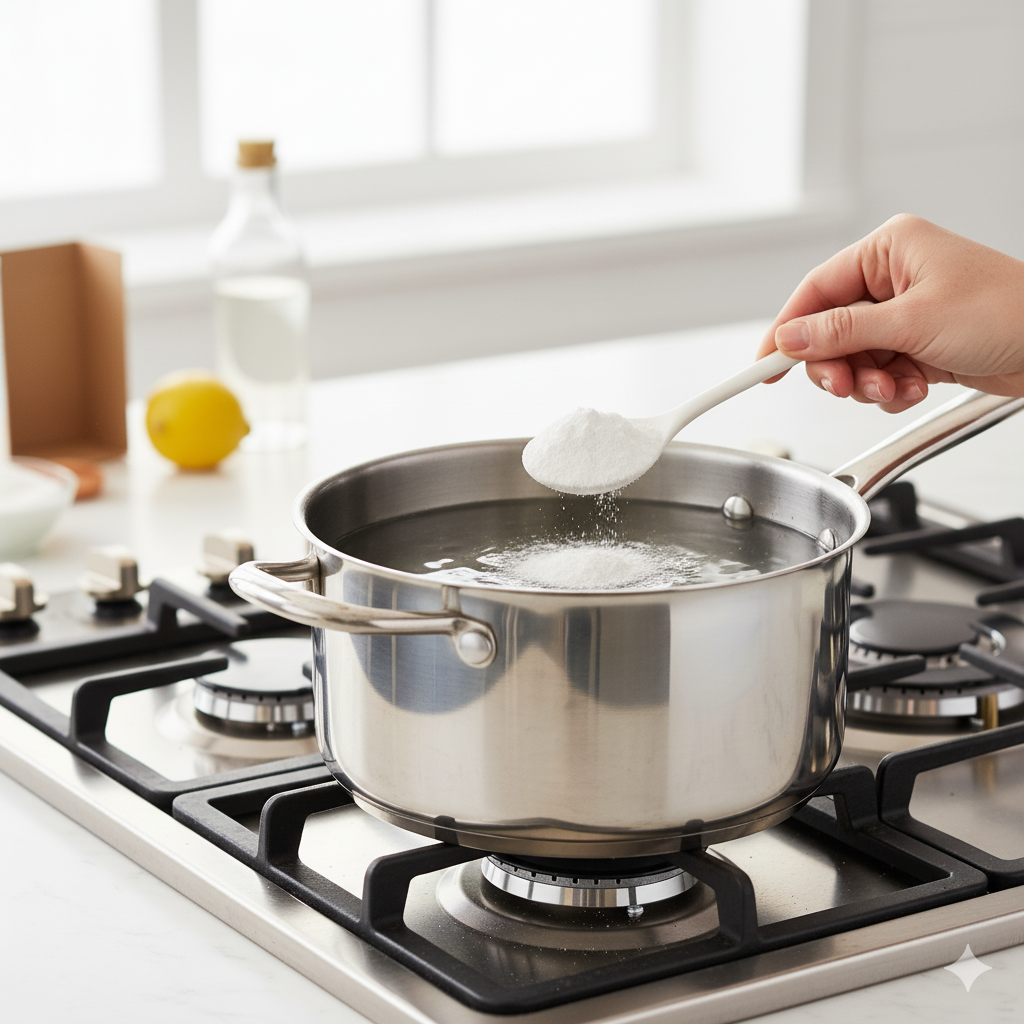 주의사항: 알루미늄 냄비는 베이킹소다에 의해 변색될 수 있으므로 이 방법을 사용하지 않는 것이 좋습니다.