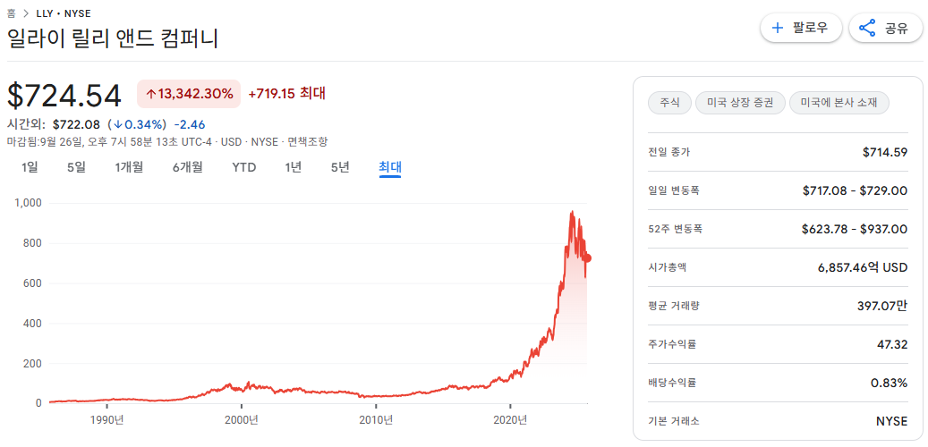 - Eli Lilly (NYSE: LLY): 2025년 9월 26일 종가 기준 약 $724.60입니다. (출처: Google Finance)