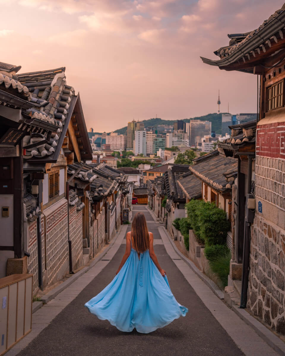 | 북촌한옥마을 (Bukchon Hanok Village, 서울) | 약 37.5826° N, 126.9834° E | 전통 한옥 거리 + 서울 타워 전망 배경. 좁은 골목이 사진 포인트. Flying Scots Girl - Cat Thomson+2voyagefox+2 |