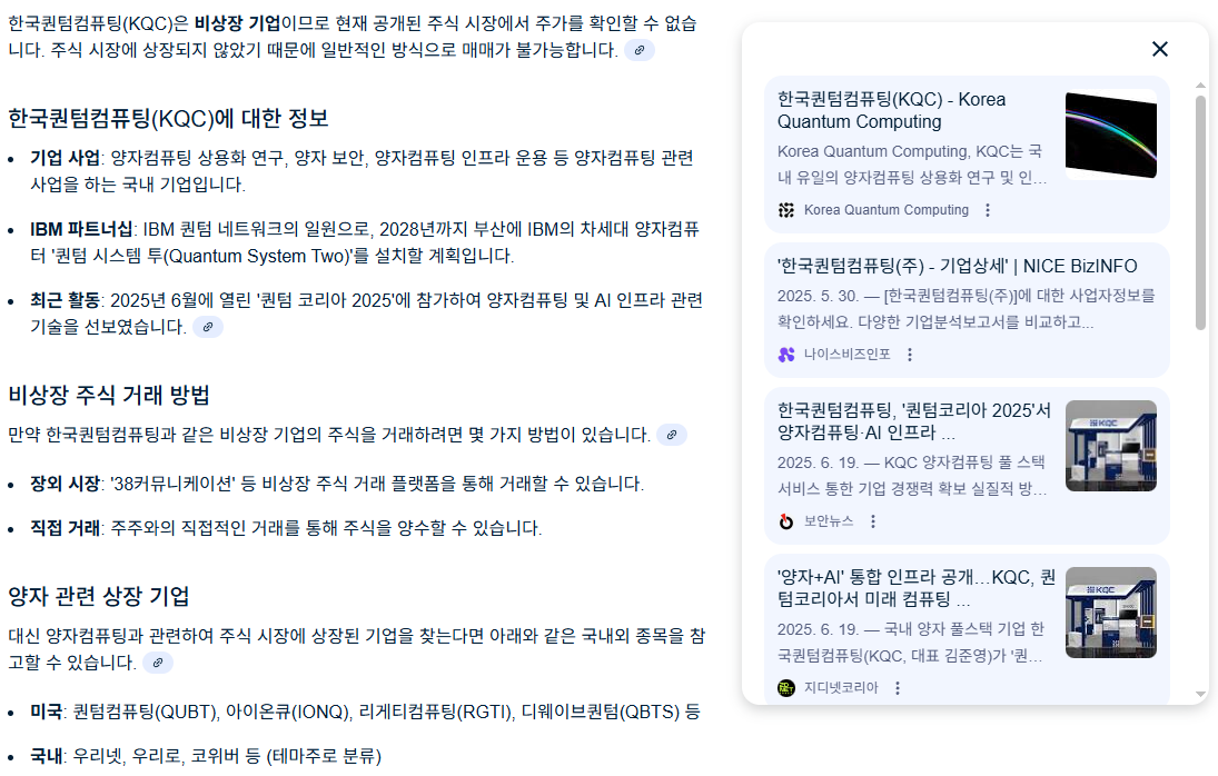 - 한국퀀텀컴퓨팅 (KQC): 국내 유일의 양자 컴퓨팅 상용화 연구 및 인프라 운영 전문 기업을 표방합니다. 해외 양자 컴퓨터에 대한 클라우드 접속 서비스, 컨설팅 및 교육을 제공하며, 금융, 바이오, 물류 등 산업별 맞춤형 알고리즘을 개발하고 있습니다.