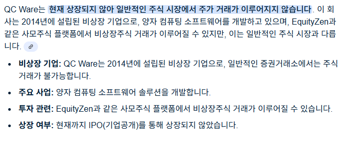 - SDT: 양자 표준 기술 전문 기업이자 국내 양자 컴퓨터 제조업체를 목표로 하고 있습니다. 양자 컴퓨터의 핵심 부품인 제어 장비를 상용화하고 있으며, 최근 200억 원 규모의 Pre-IPO 투자 유치에 성공했습니다. 2025년 국내 1호 양자 기술 상장 기업을 목표로 하고 있습니다.