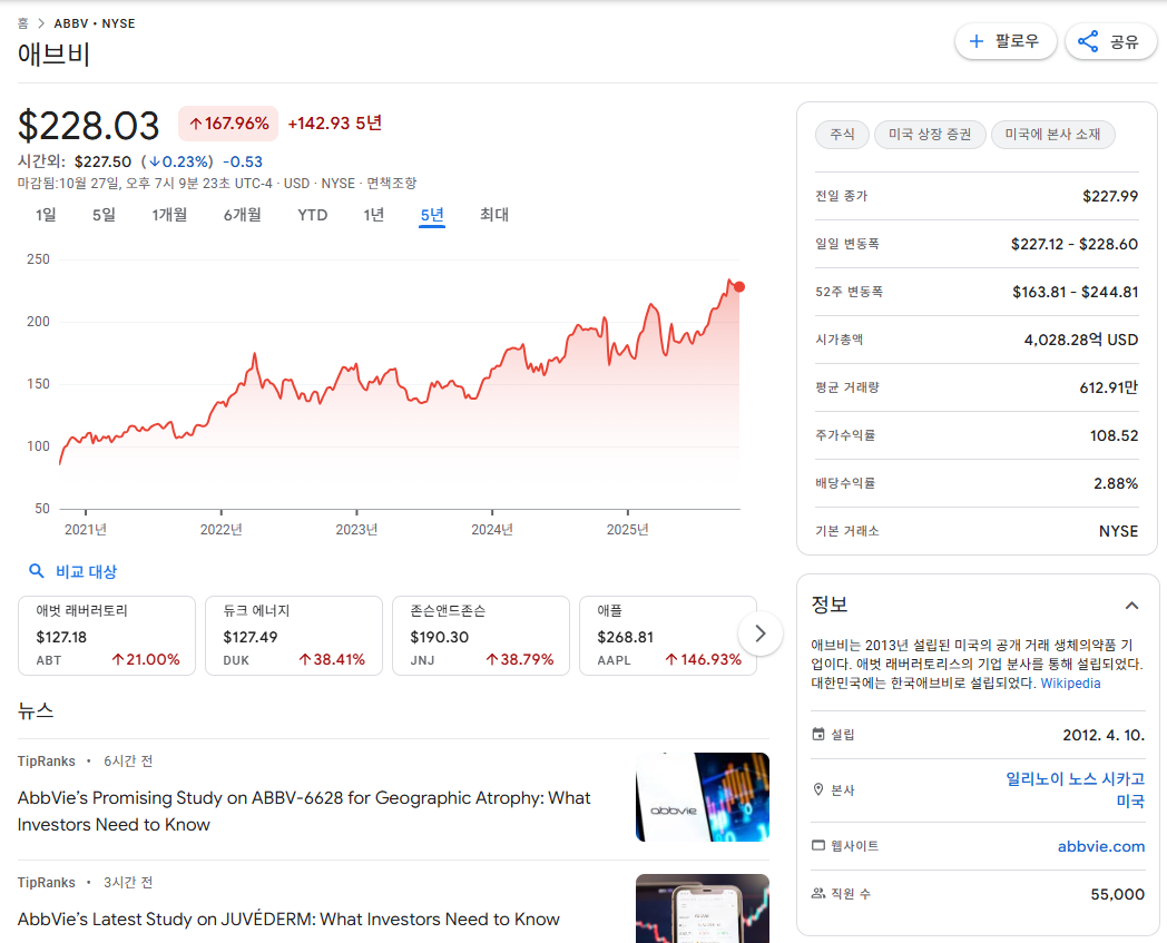 - 특징: 애브비는 분사 이후 매년 배당금을 인상해 온 '배당 왕족(Dividend Aristocrat)' 주식입니다.