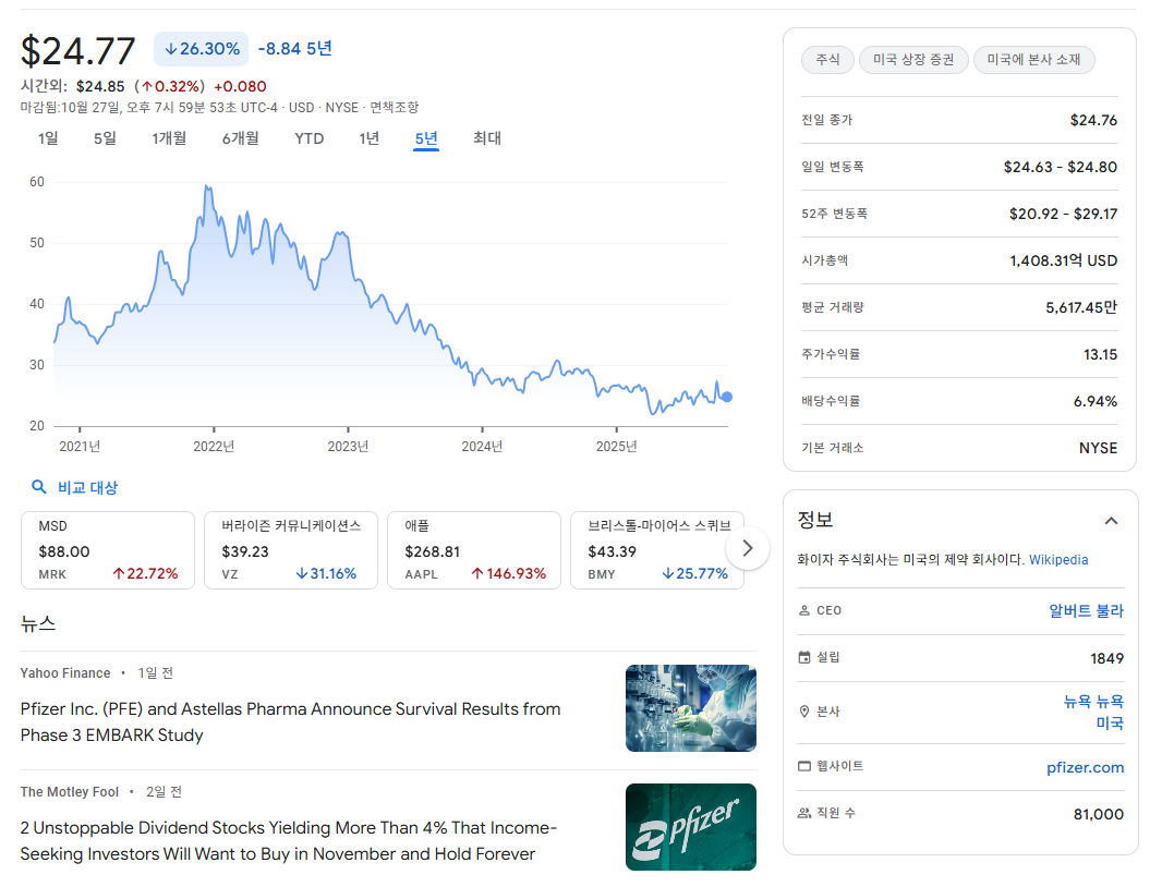 - 화이자는 현재 '고성장주'가 아닌 '고배당 가치주' 또는 '턴어라운드' 주식으로 분류됩니다. 투자자들은 시젠 인수를 통한 성장에 베팅하기보다, 높은 배당금을 받으며 기다리는 전략을 취하고 있습니다.