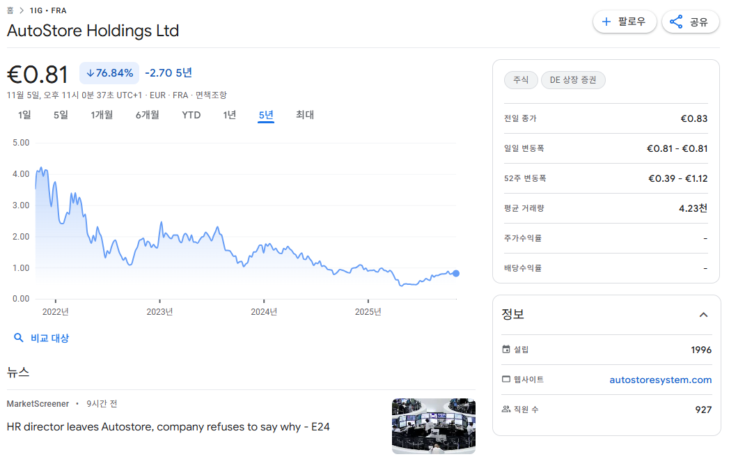 | AutoStore (AUTO.OL) | 큐브형 AS/RS | 노르웨이 | ~29억 달러 (322억 NOK) | ~24.5배 (TTM) | 높은 수익성 (큐브 시장 선도) |
