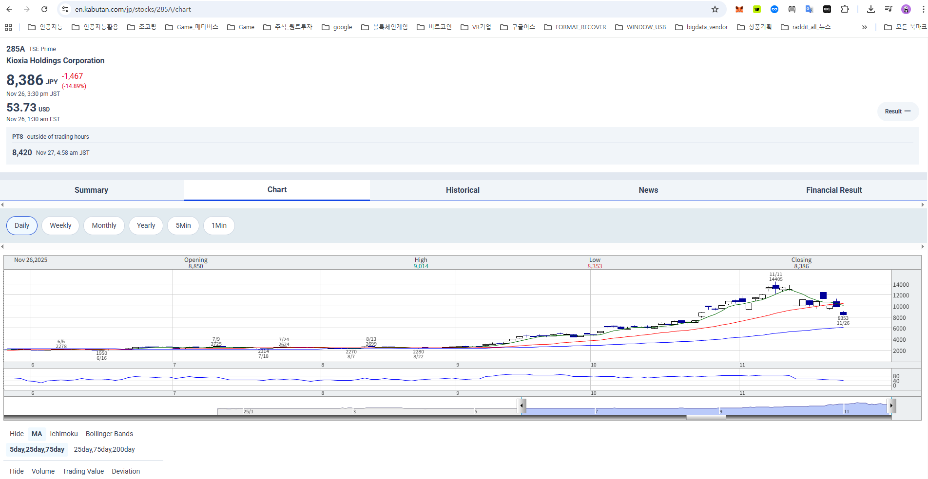 - 도쿄증시(285A) 기준 최근 가격: 약 8,400엔 전후 (11/26/2025 기준, 전일 대비 하락, 52주 범위 1,440–14,405엔) Investing.com+2TradingView+2
