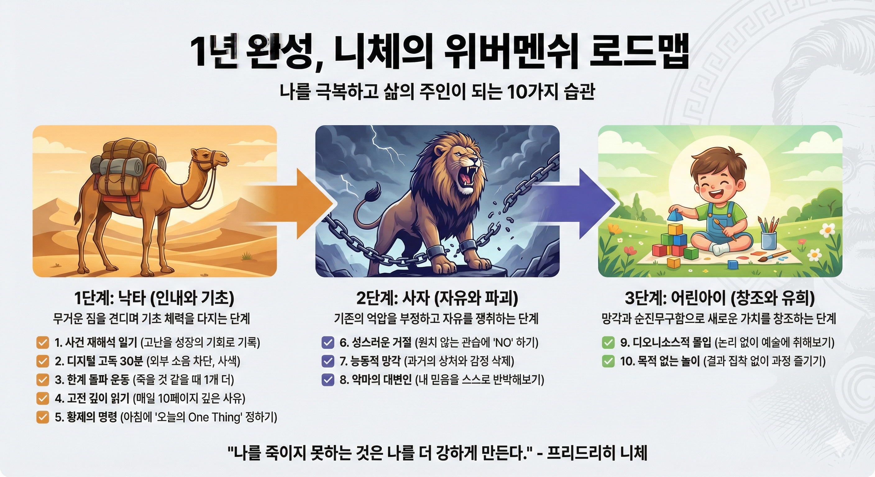 니체의 사상(위버멘쉬, 아모르 파티)을 바탕으로, 딱 1년만 반복하면 뇌 구조와 인생의 궤도를 완전히 바꿔놓을 5가지 핵심 습관을 제안합니다. 이는 단순한 자기계발이 아니라, 자신을 '극복'하는 훈련입니다.