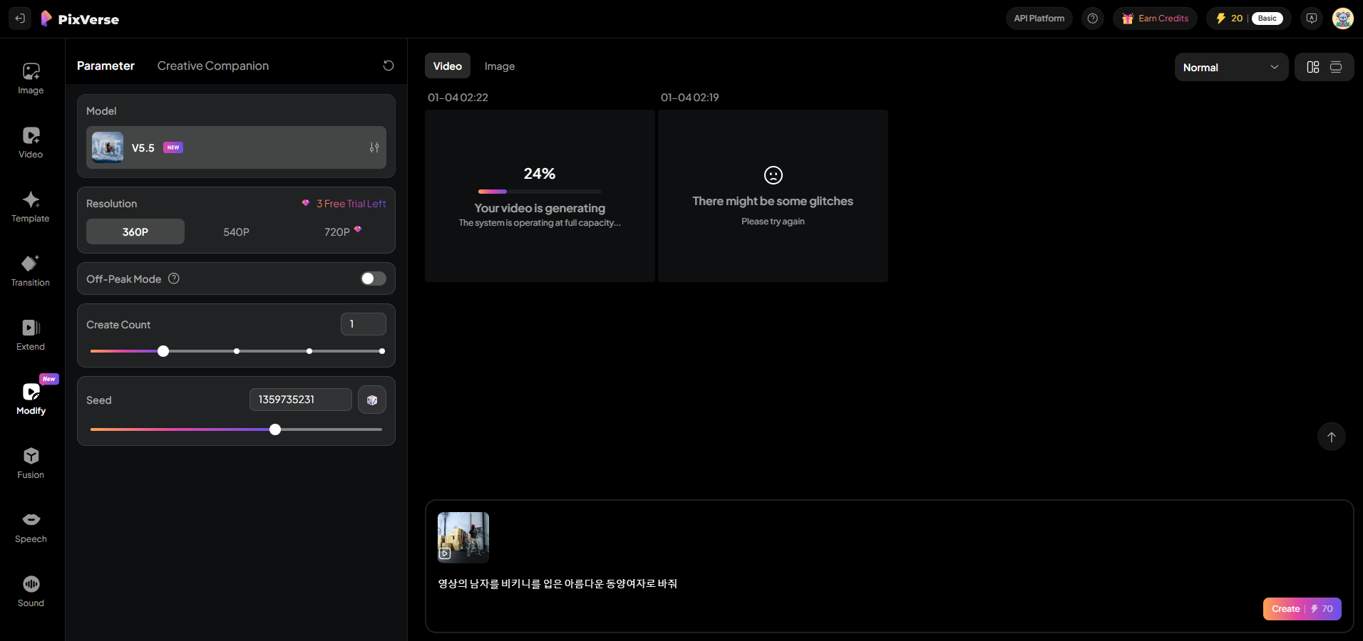 3번 시도 끝에 영상이 생성되었지만 결과물은 실망스럽다. (70 크레딧만 낭비하고 사용할수없는 영상만 생성되었다 )