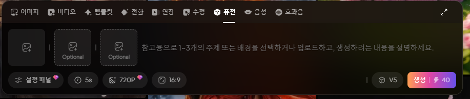 - Character to Video (신규): 특정 캐릭터의 일관성을 유지하며 영상을 생성하는 기능이 베타 형태로 제공되고 있습니다.