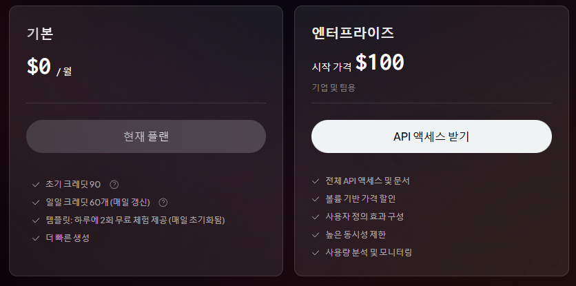 | Standard | 약 $10 (약 1.3만원) | 더 많은 크레딧, 워터마크 제거, 우선순위 대기열, 일부 고급 기능 잠금 해제 | 본격적인 크리에이터 입문 |