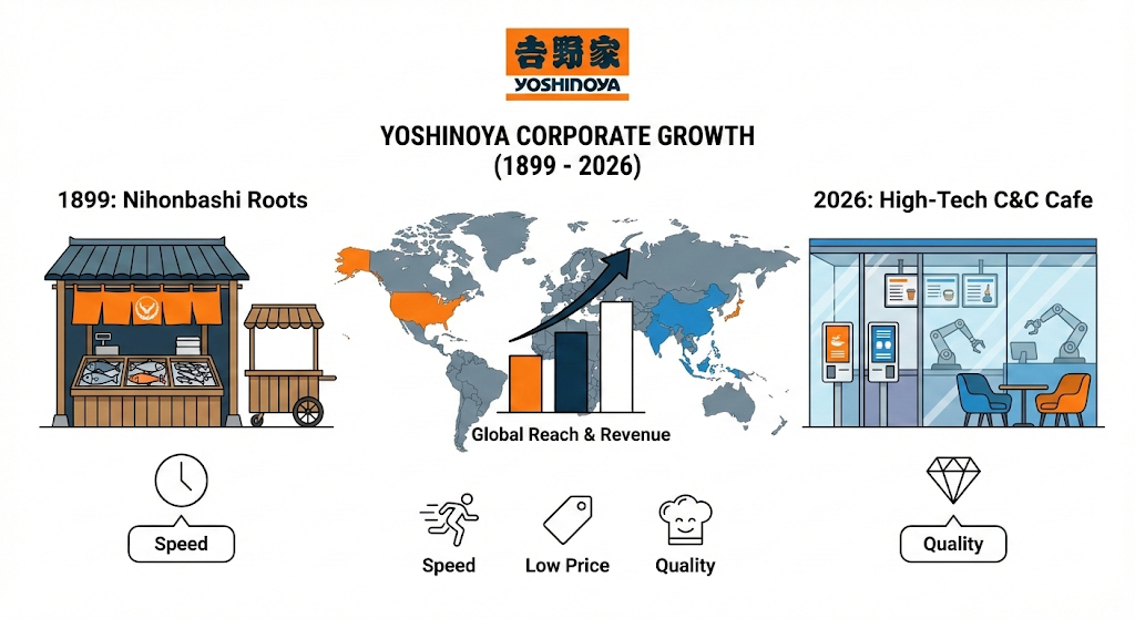 - 핵심 가치: "맛있고, 싸고, 빠르다(うまい、やすい、早い)"