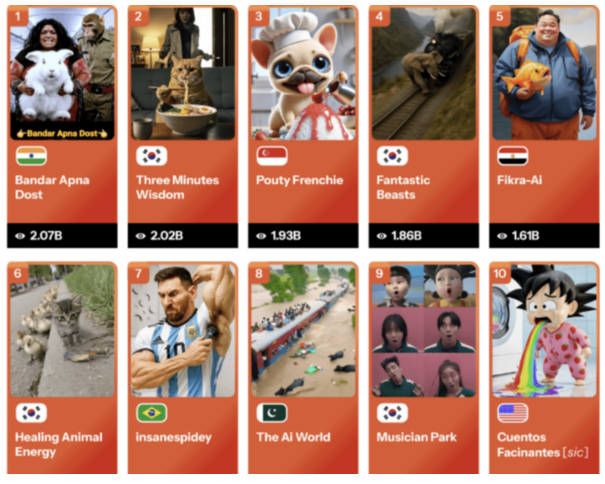 | 1 | Bandar Apna Dost | 인도 기반의 AI 생성 액션/코미디 채널 | 원숭이와 근육질 남성 캐릭터가 등장하는 짧고 자극적인 AI 영상 | 자극적인 색감, 과장된 액션 장면의 클로즈업 | 약 276만 명 | 약 20.7억 회 | 이동 |
