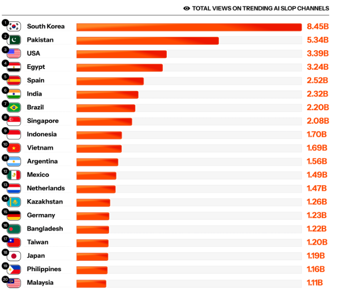 - AI 슬롭(Slop) 콘텐츠: 대다수 상위 채널이 인간의 개입을 최소화하고 AI로 대량 생산한 '알고리즘 최적화' 영상을 통해 수십억 뷰를 달성하고 있습니다.