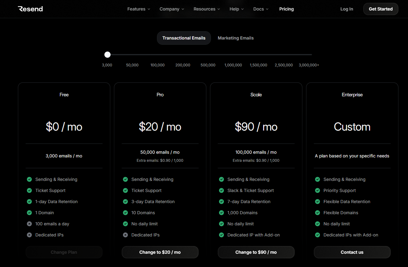 - Pro: 월 $20(약 2.7만 원). 월 5만 건 발송, 무제한 도메인, 3일간의 로그 보관.