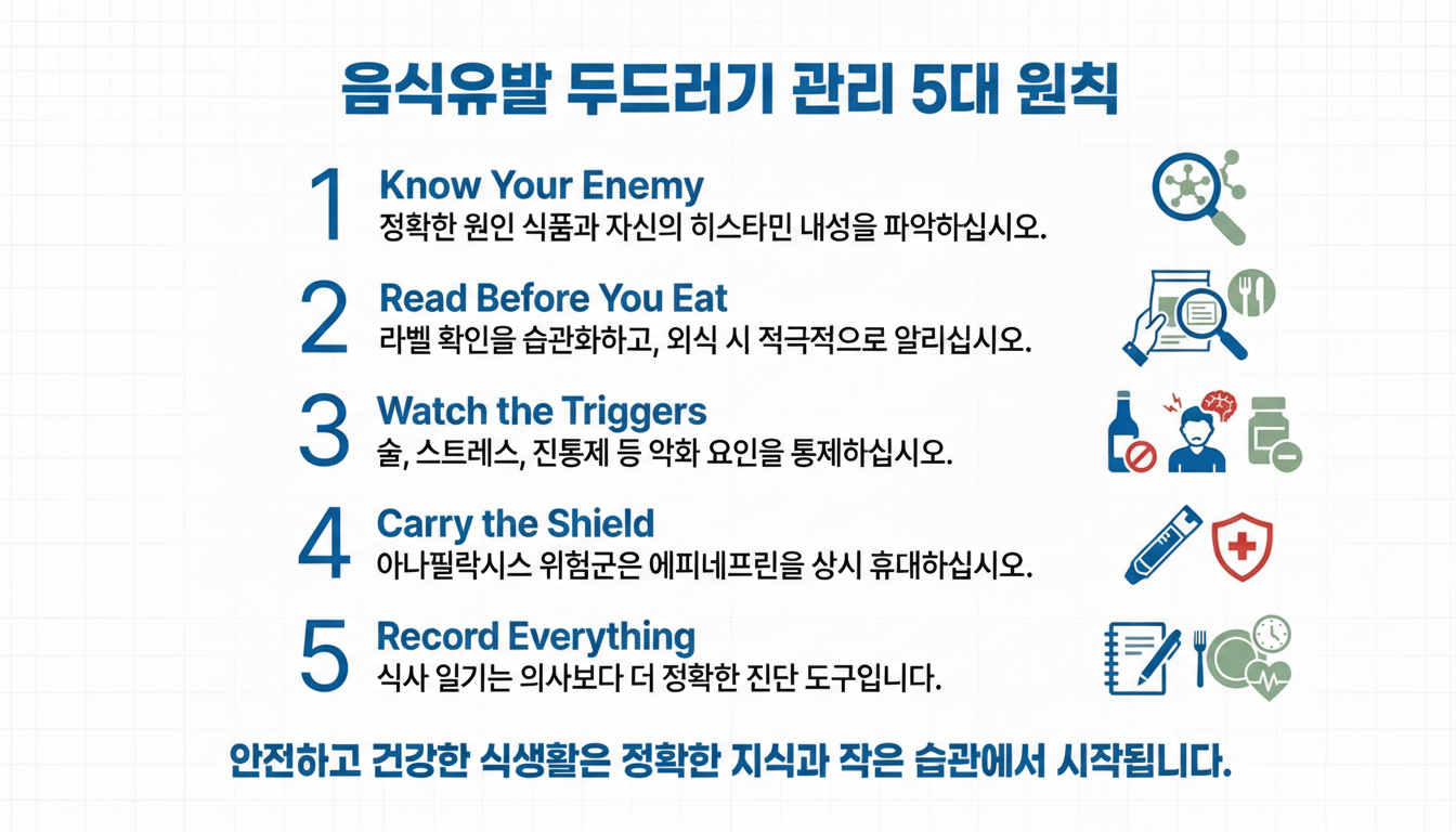 [!CAUTION] 만약 음식을 먹은 후 두드러기와 함께 호흡 곤란, 어지러움, 입술이나 혀의 부종이 나타난다면 이는 **아나필락시스(Anaphylaxis)**라는 위험한 상황일 수 있으므로 즉시 응급실을 방문해야 합니다.