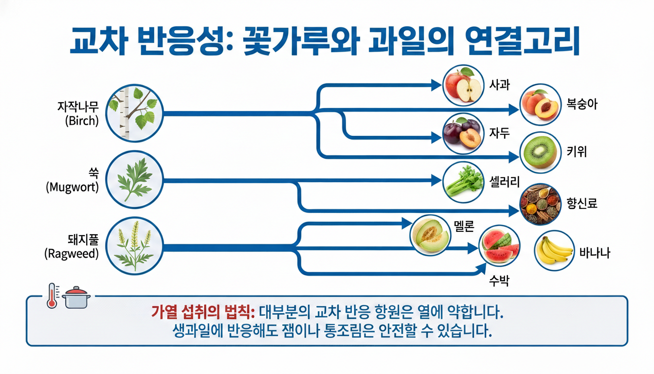 - 교차 반응 주의: 예를 들어 꽃가루 알레르기가 있다면 특정 과일(사과, 키위 등)에도 반응할 수 있습니다(구강 알레르기 증후군).