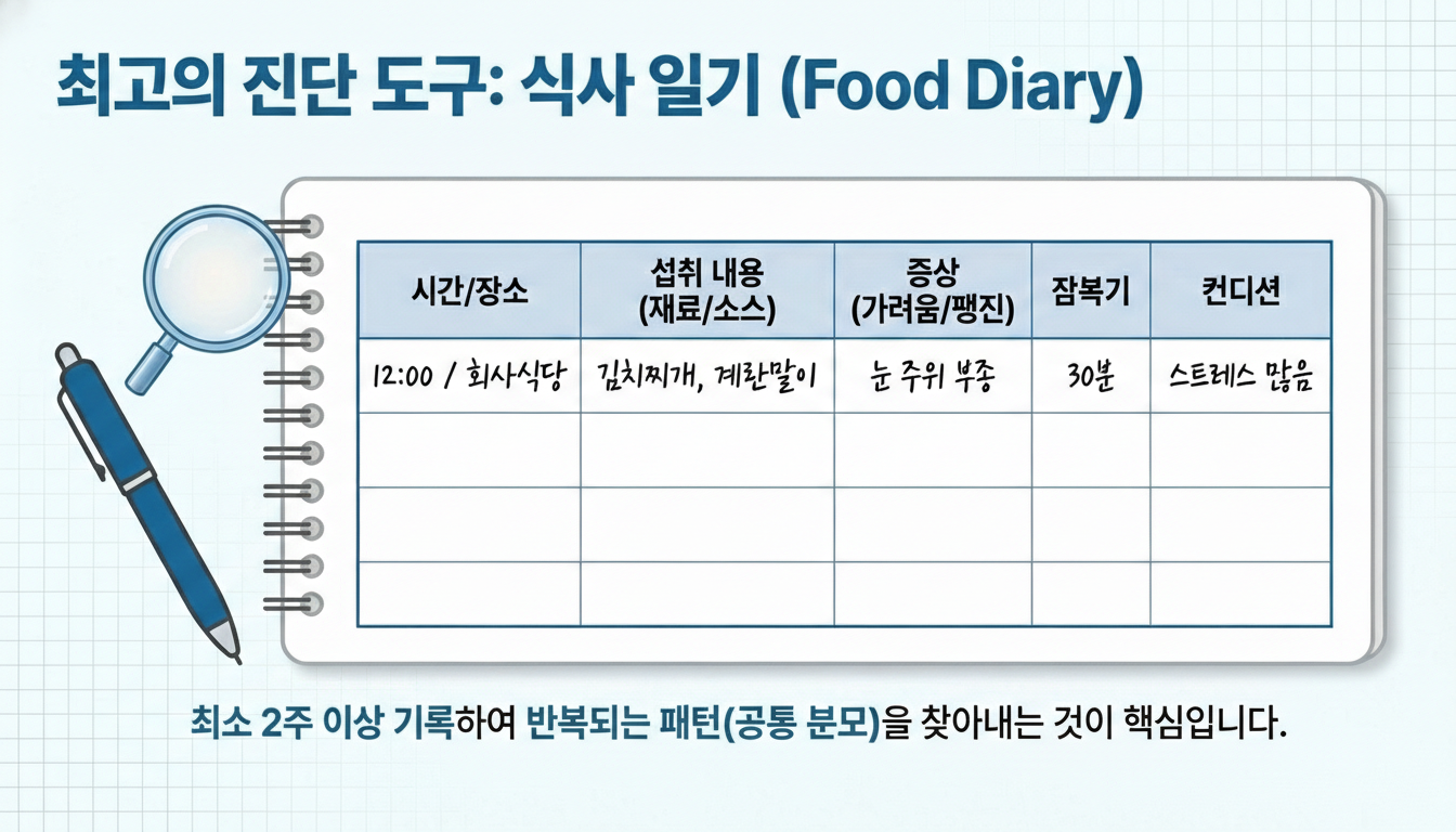 - 식단 일기 작성: 두드러기가 발생하기 6~12시간 전에 먹은 음식을 기록해 보세요. 반복적으로 나타나는 '범인'을 찾기에 가장 좋은 방법입니다.