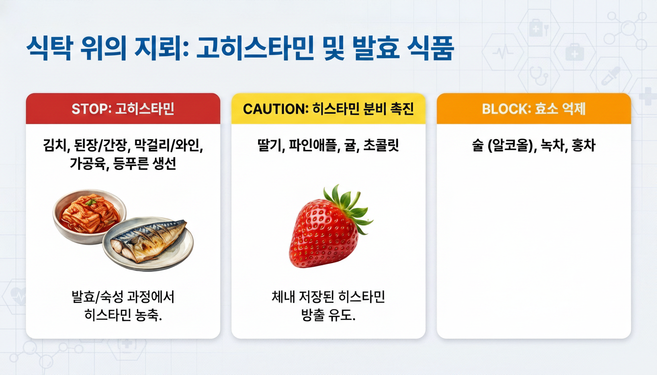 - 가공육 및 등푸른 생선: 소시지, 햄, 고등어, 꽁치(선도가 떨어질수록 히스타민 급증).