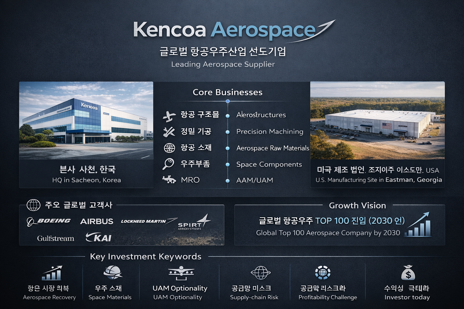 | 켄코아 | 항공구조물·정밀가공·원소재·우주·MRO 복합형 | 미국 생산거점, 글로벌 고객 다변화, 우주/AAM 옵션 | 적자 변동성, 규모의 경제 부족 |