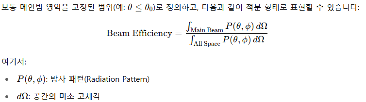 Beam Efficiency는 안테나 이론에서 자주 사용되는 개념으로, 전체 안테나 방사 에너지 중 실제 유용한 방향(주로 메인 빔)에 포함된 에너지의 비율을 의미합니다.