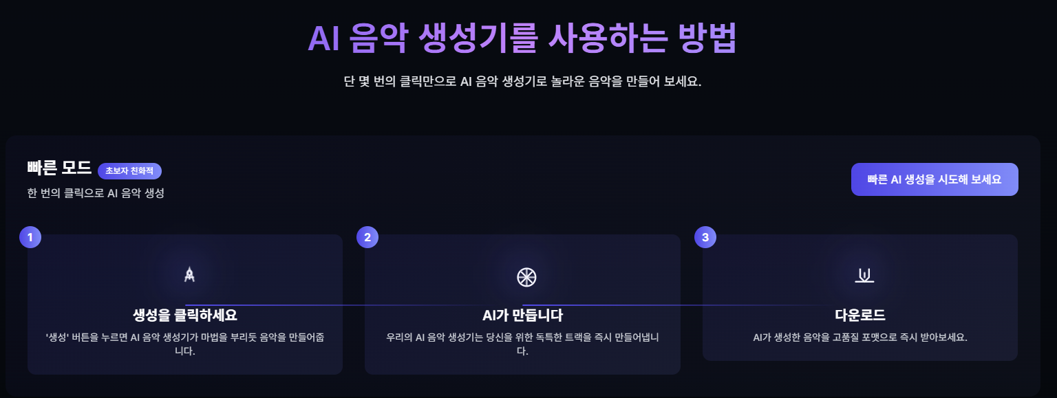 초보자는 단지 클릭만으로 자동으로 인공지능이 알아서 음악을 생성해줍니다.