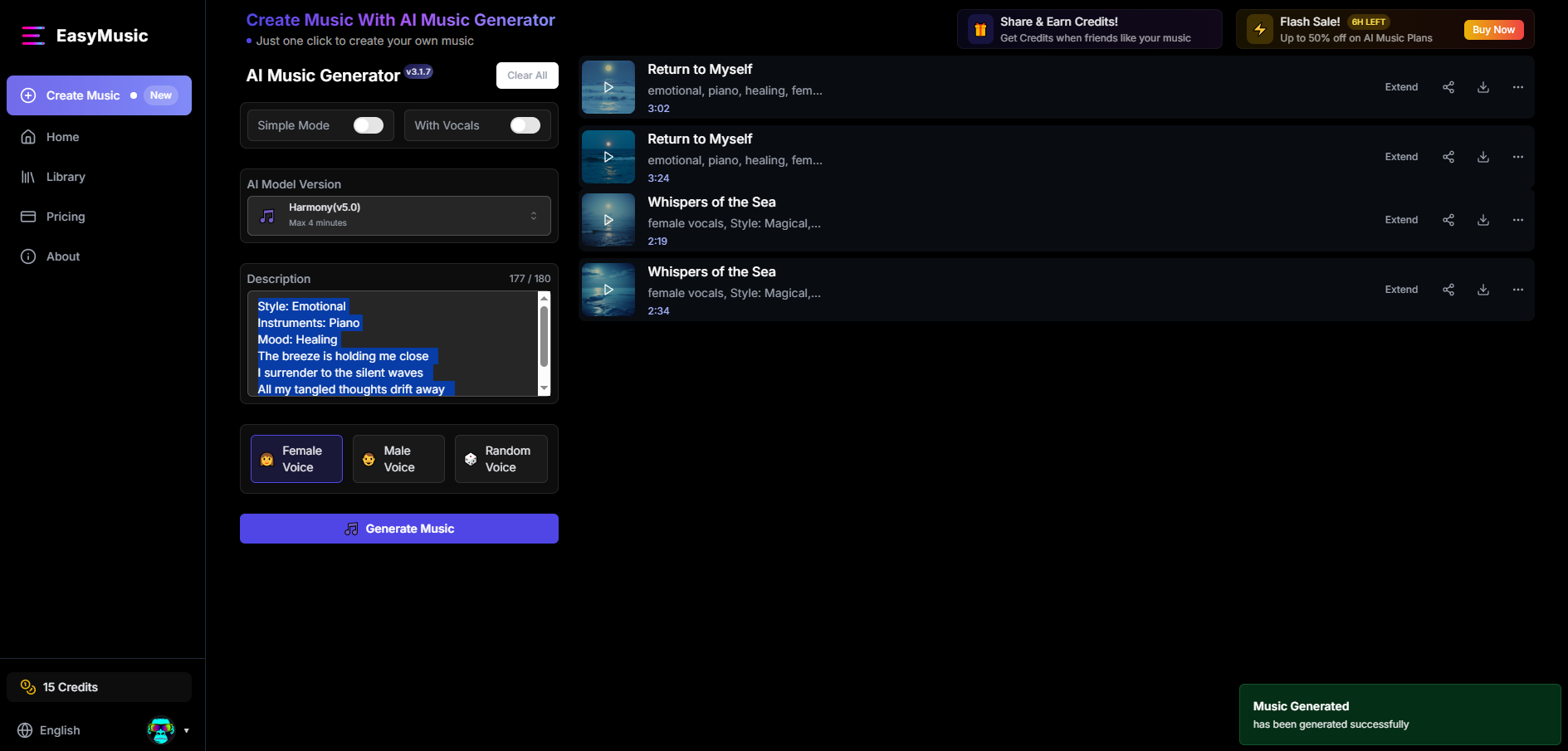 Create Music 를 누르면 다음과 같은 화면이 나온다.15 Credit 이 줄어든다( 초기 30 Credit에서 지금은 15 가 줄어들었다)