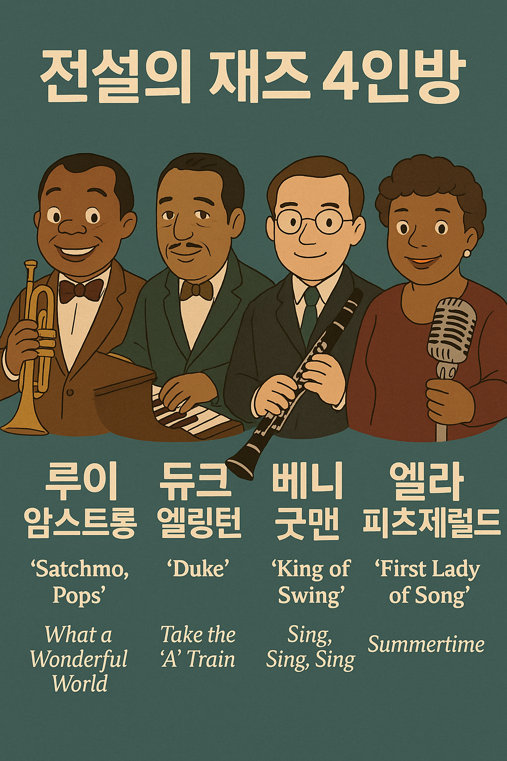| 항목 | 루이 암스트롱 🎺 | 듀크 엘링턴 🎹 | 비니 굿맨 🎷 | 엘라 피츠제럴드 🎤 |