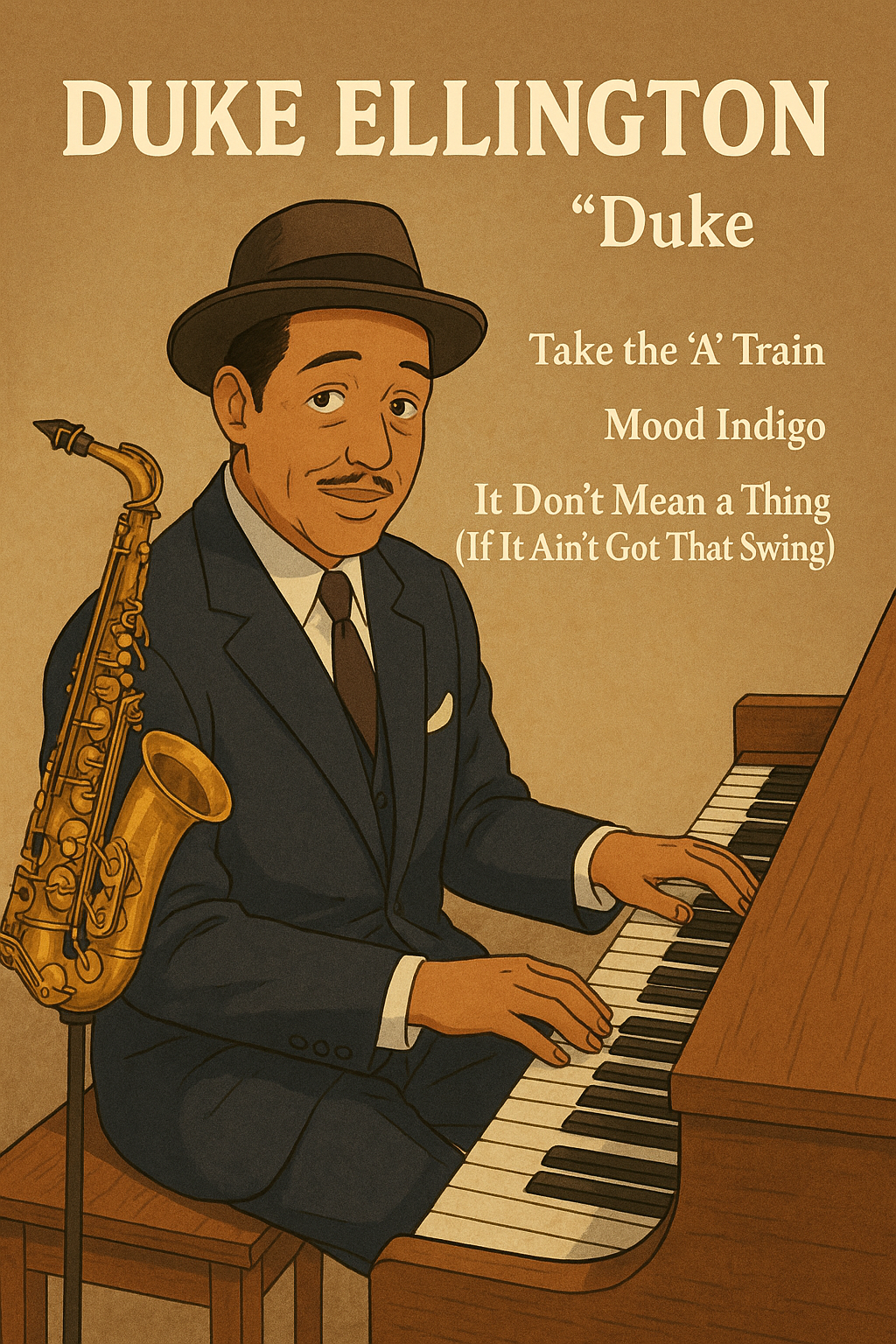 🎩 **듀크 엘링턴(Duke Ellington)**은 20세기 재즈의 황금기를 대표하는 작곡가, 피아니스트, 빅밴드 리더입니다. 그는 재즈를 단순한 대중음악이 아닌 고급 예술의 영역으로 끌어올린 인물로 평가받으며, 1,000곡 이상의 작품을 남긴 미국 음악사의 거장입니다.