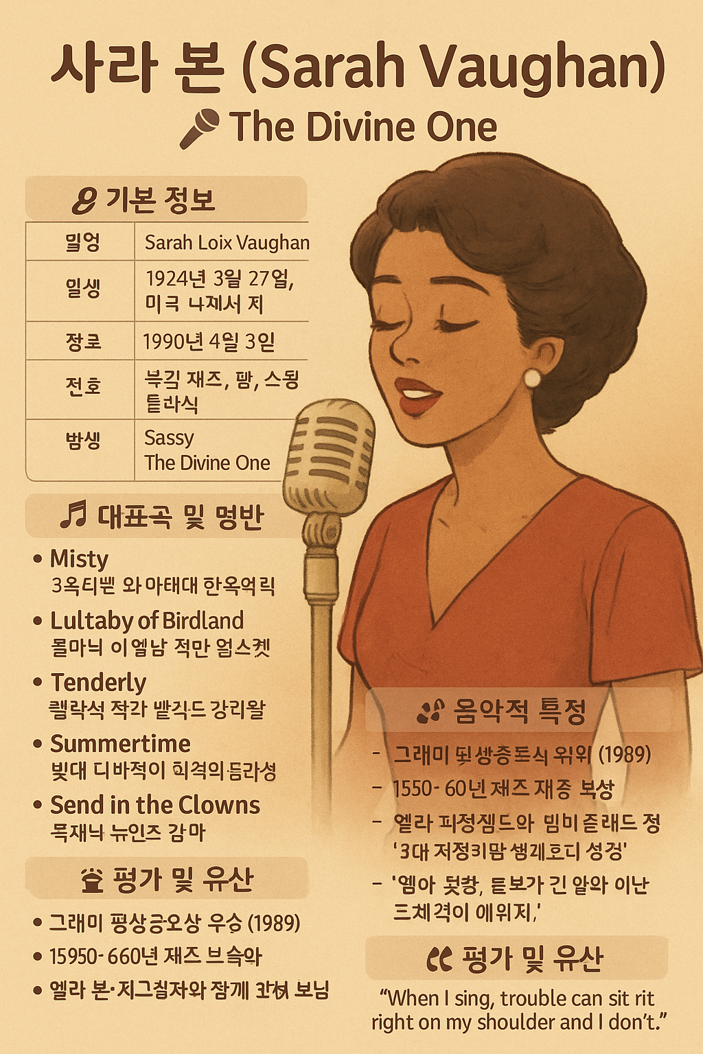 🎤 **사라 본 (Sarah Vaughan)**은 재즈 보컬 역사에서 엘라 피츠제럴드와 함께 가장 뛰어난 여성 보컬리스트로 평가받으며, 그녀만의 풍부한 음역, 성악적인 기교, 스캣 능력으로 “The Divine One(신성한 여인)”이라는 별칭을 얻었습니다.