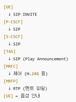 | 동작 방식 | SIP INVITE → TAS 또는 AS가 MRFC에 안내 요청 → MRFP가 음성 재생 |