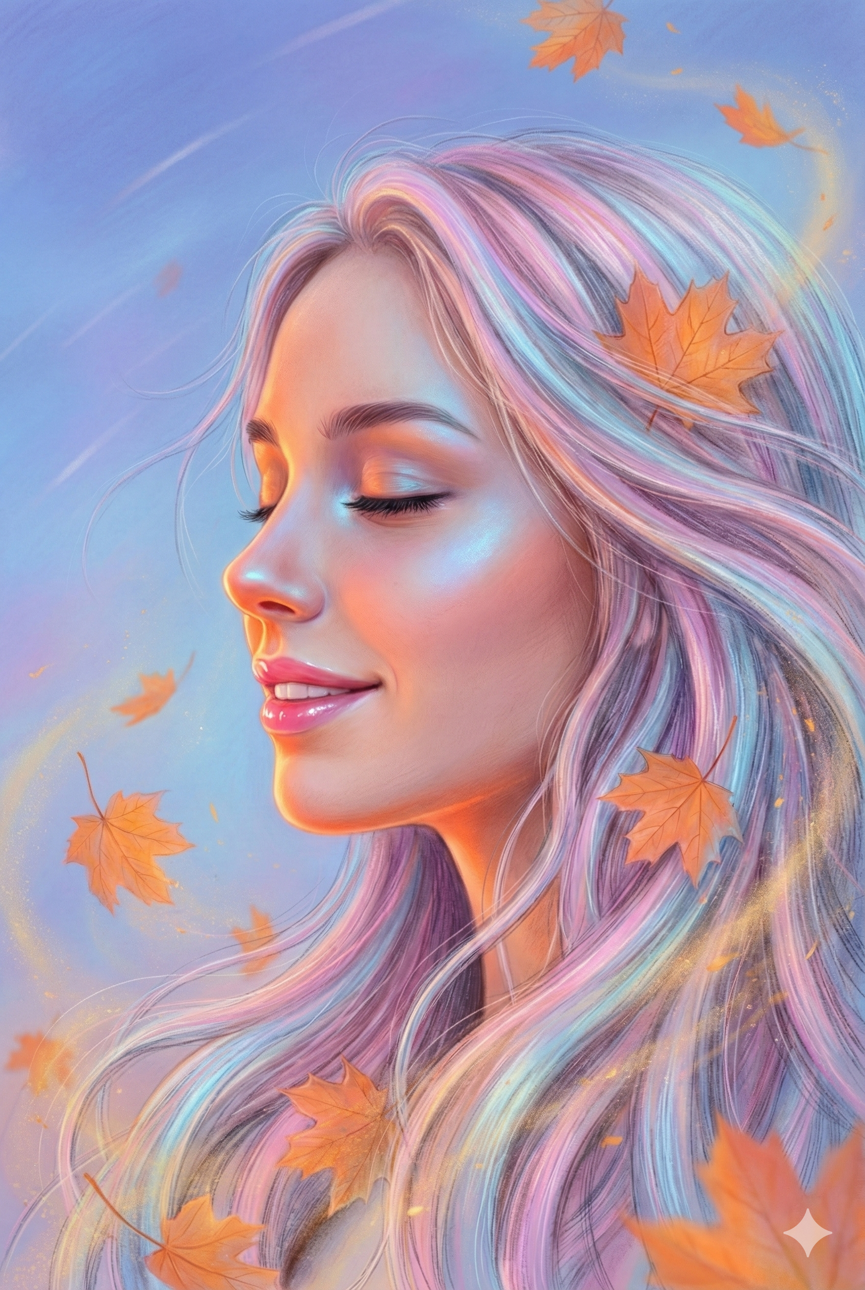 ultra detailed digital painting of a beautiful young woman, side profile, eyes closed, serene expression, long flowing hair blowing in the wind, hair in pastel rainbow tones (pink, purple, blue, silver), illuminated with cold blue and warm orange light, fantasy autumn atmosphere, vivid colorful lighting, glowing rim light on her skin, realistic soft skin texture, glossy pink lips, smooth nose, delicate eyelashes, surrounded by floating orange maple leaves, some leaves tangled in her hair, dynamic motion lines, dreamy sky blue background with soft gradients, high contrast between blue shadows and warm orange highlights, fine pencil-like strokes and oil-paint texture combined, ethereal, magical, hyperrealistic yet painterly style, 8k, ultra high resolution, sharp focus on face, vertical composition, cinematic, artstation, trending illustration